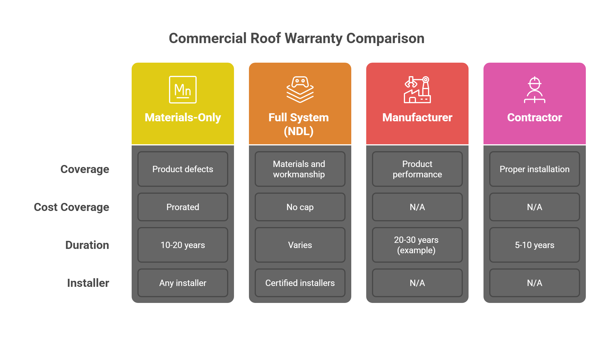 Commercial roof warranties generally fall into two broad categories: materials-only and full system (also known as No Dollar Limit or NDL warranties). A materials-only warranty is the most basic, covering defects in the roofing products themselves—think manufacturing flaws in TPO membranes that cause premature cracking—but it won’t touch labor costs for fixes. These often last 10-20 years and are prorated, meaning your payout decreases over time.